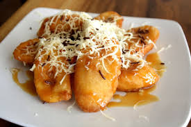 Setelah itu,siapkan piring saji,tata gorengan durian di atas nya,siram dengan saus karamel dan taburi dengan keju parut